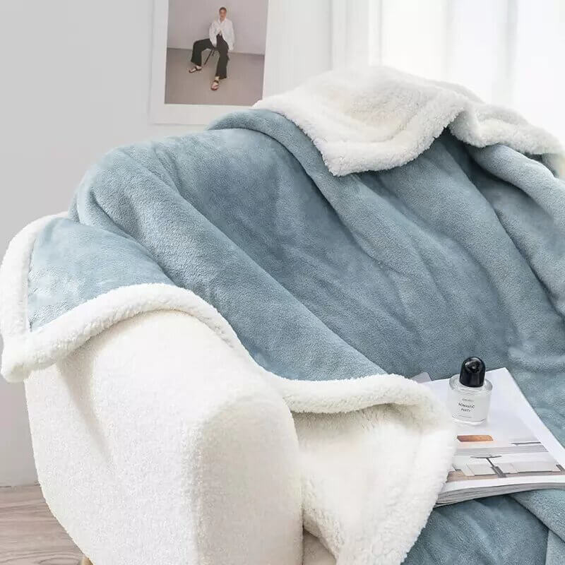 Es una manta de tela sherpa calentita ideal para invierno, te hará pasar buenos momentos cuando estes en el sofá. La manta borreguito reversible con tacto extra suave en color azul tiene dos tamaños grandes para taparte cómodamente o cubrir el sofá o la cama.